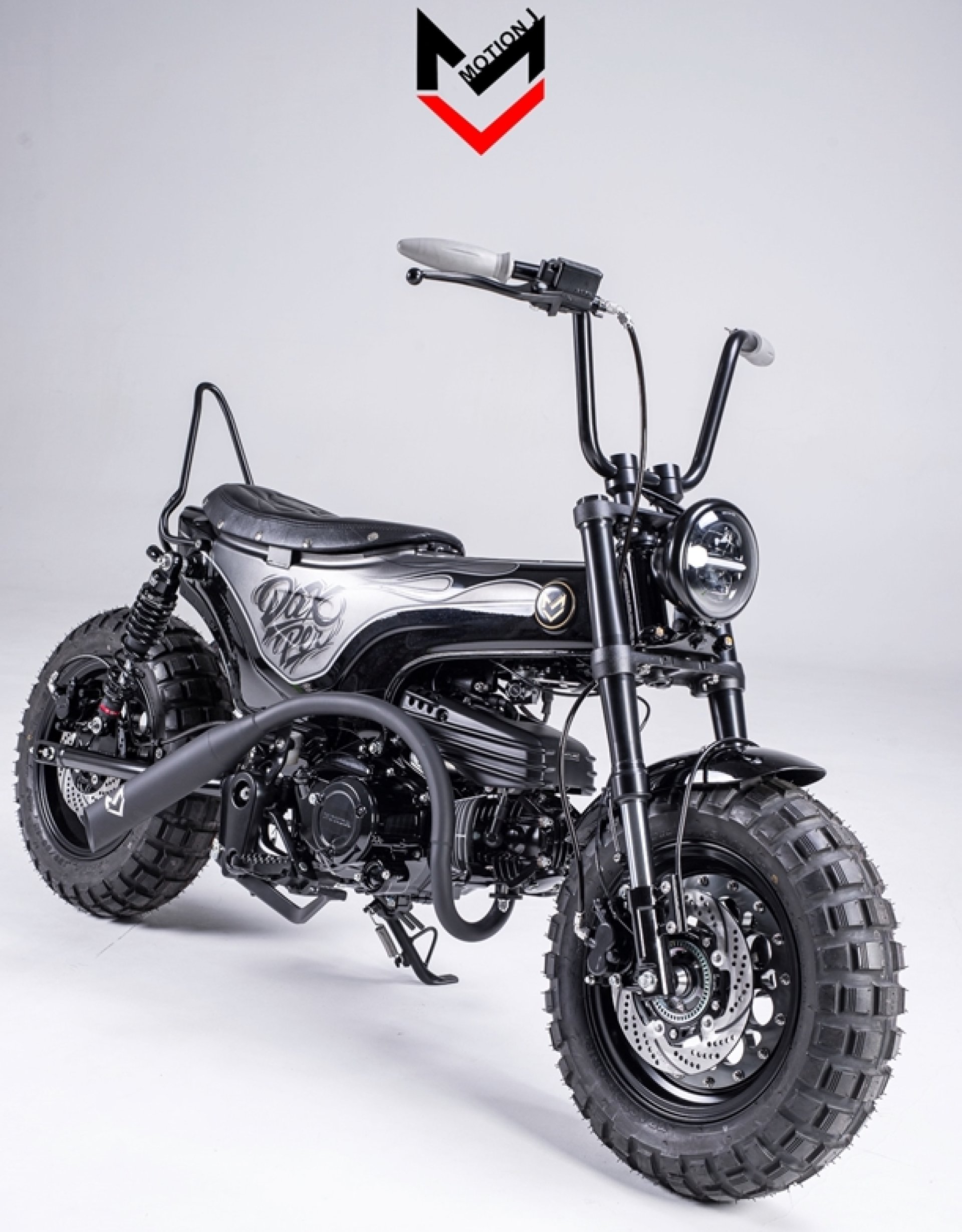 The HONDA ST125 Dax [Daxper] is recognized for its distinctive Chopper style. It features a unique identity that sets it apart from the original design. The swingarm length is extended by 3 inches, and it is equipped with large CNC wheels. The handlebars are elevated, and the wires are concealed to present a clean appearance, devoid of any visible accelerator. In person, this model leaves a lasting impression.