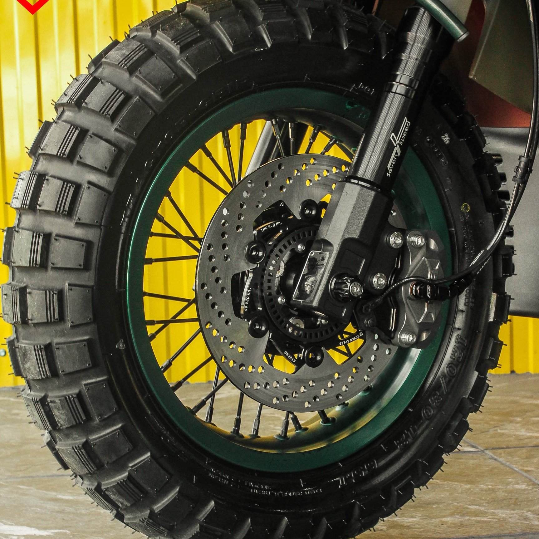 ホイールセット全体がワイヤースポークホイールに交換され、バイクの美観が向上しました。さらに、ブレーキシステム全体がアップグレードされ、パフォーマンスが向上し、タイヤは完全に大型のものに交換され、バイクの処理がさらに向上しました。