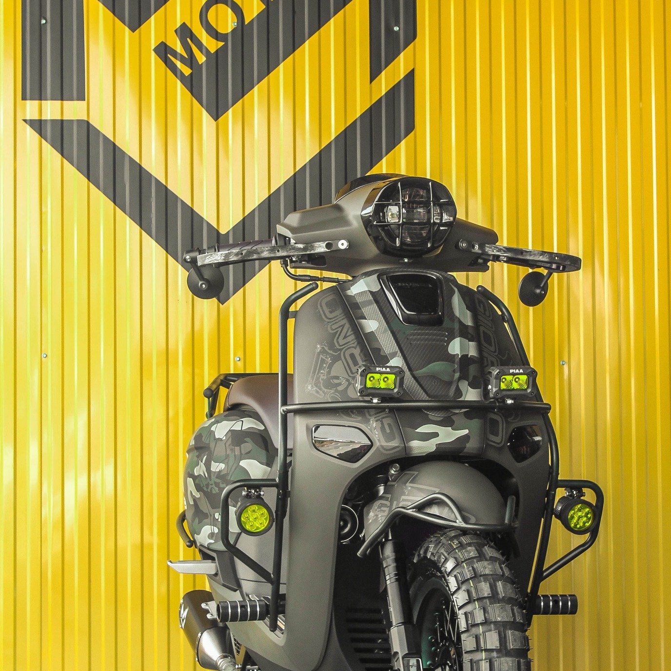カスタムアクセサリーの取り付けには、クラッシュバー、ヘッドライト、ハンドガード一式、および機能性とスタイルを強化する追加の照明システムが含まれます。